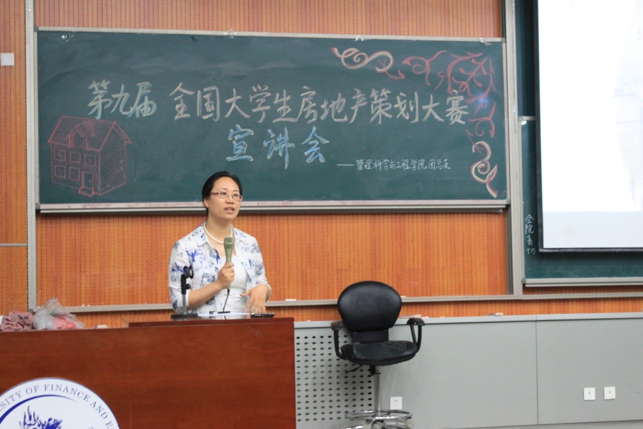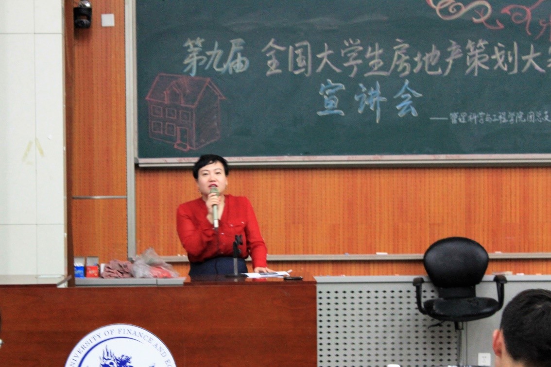 经理致辞后,来自xcsports文化与传媒公司的2007级毕业生贾春晖女士为同学们带来了她在房地产行业中打拼后的心得,为同学们介绍了房地产近几年的发展前景,她热爱房地产事业并认为这一事业行业在未来将有很大的发展空间有很大的发展前景,。贾春晖女士对我们中财的同学们很有信心,并祝福学弟学妹们能在比赛中赛出自己的最高水平。