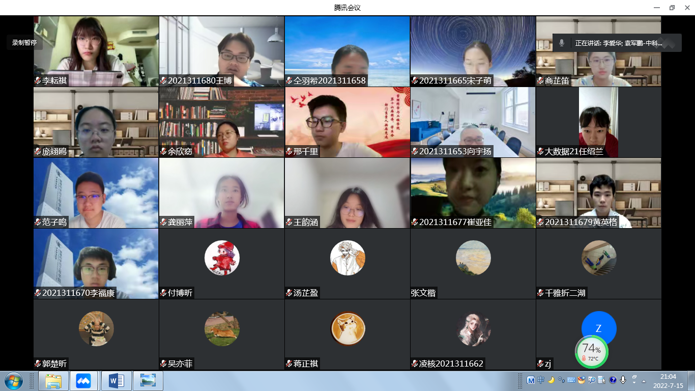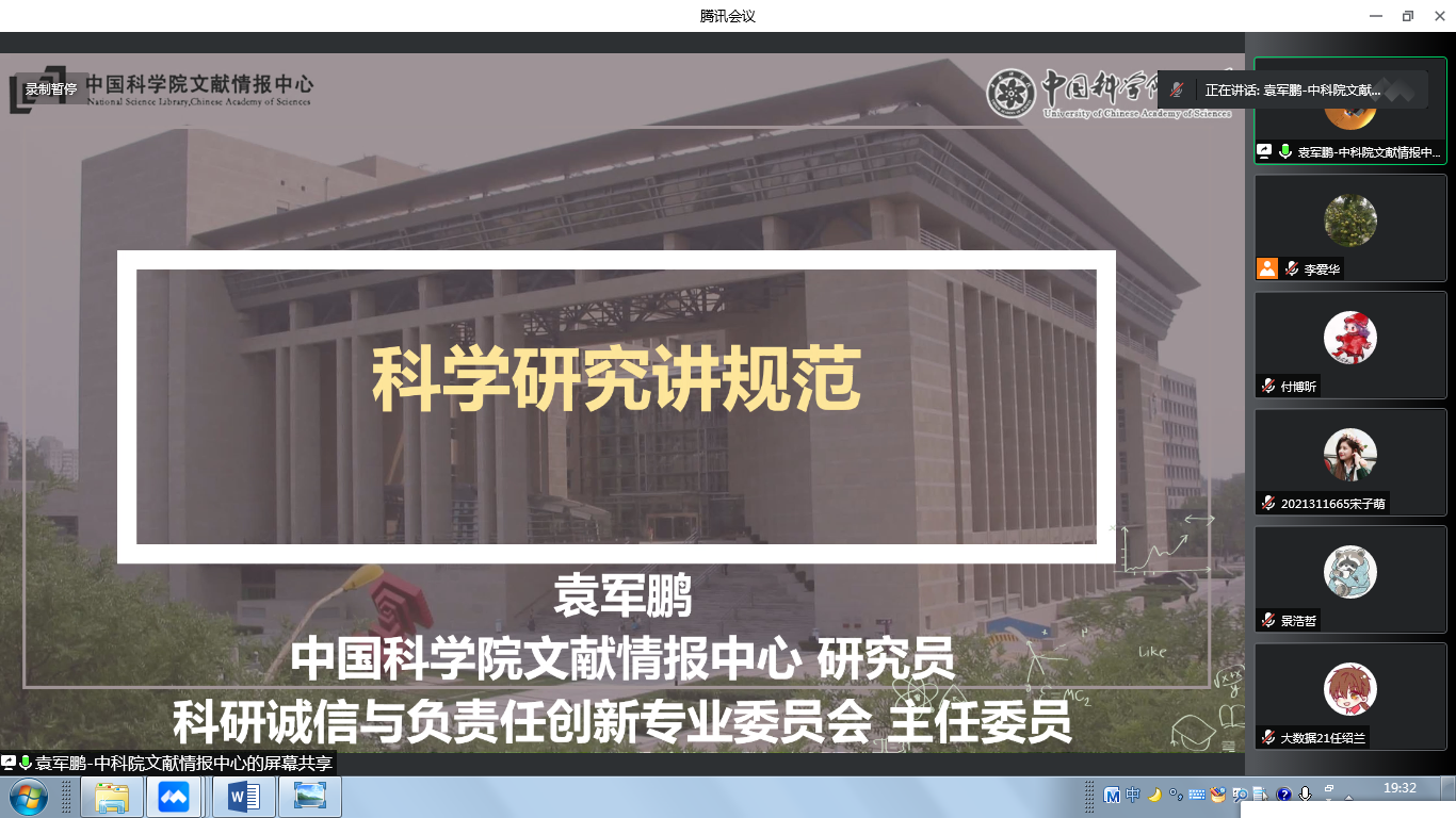 2022年7月15日晚19:30,xc体育情报文献中心研究员、xc体育大学岗位教授、博士生导师袁军鹏受邀来为2021级“许国志大数据英才班”同学做关于科学研究规范的讲座。