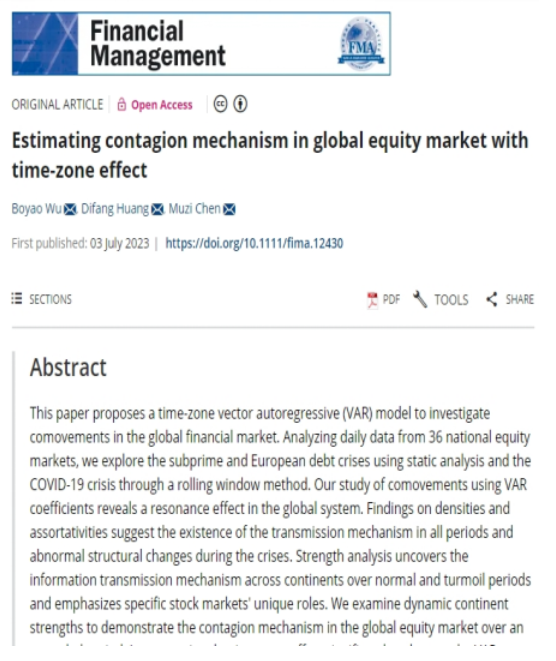 xc体育投资系副教授陈暮紫博士,与对外经济贸易大学武伯尧博士、香港大学黄棣芳博士合作撰写的论文“Estimating Contagion Mechanism in Global Equity Market with Time-Zone Effects“于2023年9月在金融管理国际权威期刊《Financial Management》正式发表,期刊是xcsports英文AA类期刊,陈暮紫博士为共同通讯作者。