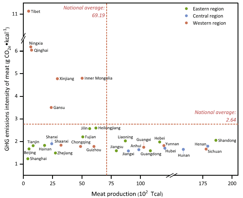 本研究采用基于过程的生命周期模型量化中国肉类产品的省级温室气体排放。我们考虑了四种主要畜禽产品(牛肉、羊肉、鸡肉和猪肉)在四种养殖规模(散养、小规模、中等规模和大规模养殖)下的排放场景。结果表明:2018年,我国畜牧业的温室气体排放量为4.29亿吨二氧化碳当量(CO2e)。牛肉的温室气体排放强度最高(19.6 kg CO2e/kg),其次是羊肉(10.0 kg CO2e/kg)、鸡肉(4.4 kg CO2e/kg)和猪肉(3.8 kg CO2e/kg)。从空间上看,中国西北部的畜牧业温室气体排放强度较高,为5.58g CO2e/kcal,而东部和中部地区的排放强度较低(分别为1.89和1.71g CO2e/kcal)。在省级层面,山东(3820万吨CO2e)畜牧业的温室气体排放量最高,而上海(50万吨CO2e)的排放量最低。本研究确定了肉类产品全生产链的温室气体排放热点,揭示了我国肉类温室气体排放的空间模式,助力我国畜牧业的低碳转型。