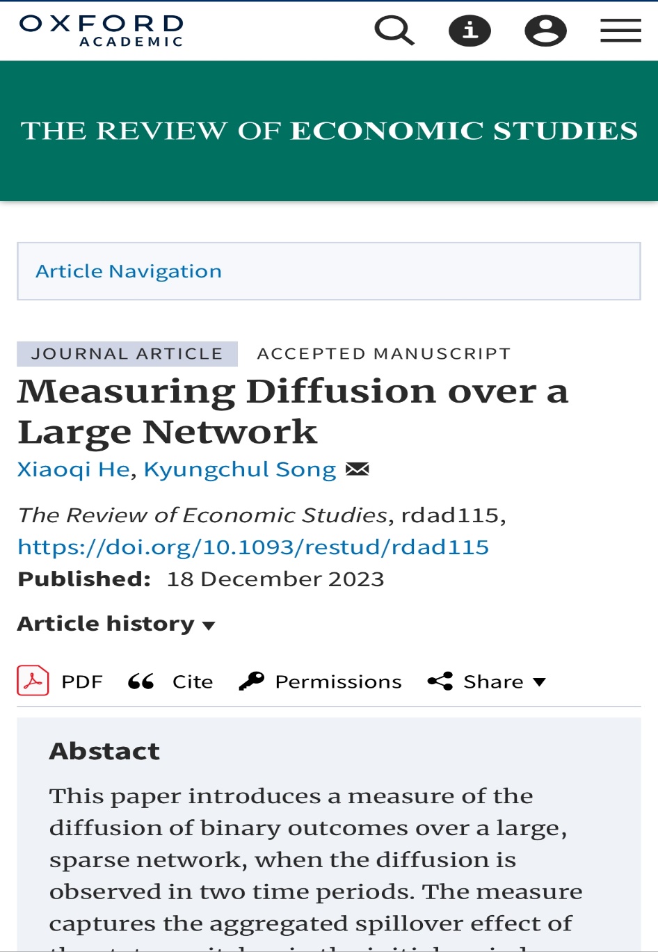 xc体育投资系助理教授何晓奇博士,与英属哥伦比亚大学的Kyungchul Song教授合作撰写的论文“Measuring diffusion over a large network”,在经济学五大顶刊之一The Review of Economic Studies接收发表(https://academic.oup.com/restud/advance-article/doi/10.1093/restud/rdad115/7477820?login=true)。何晓奇博士是该论文的第一作者,xcsports是第一作者单位。