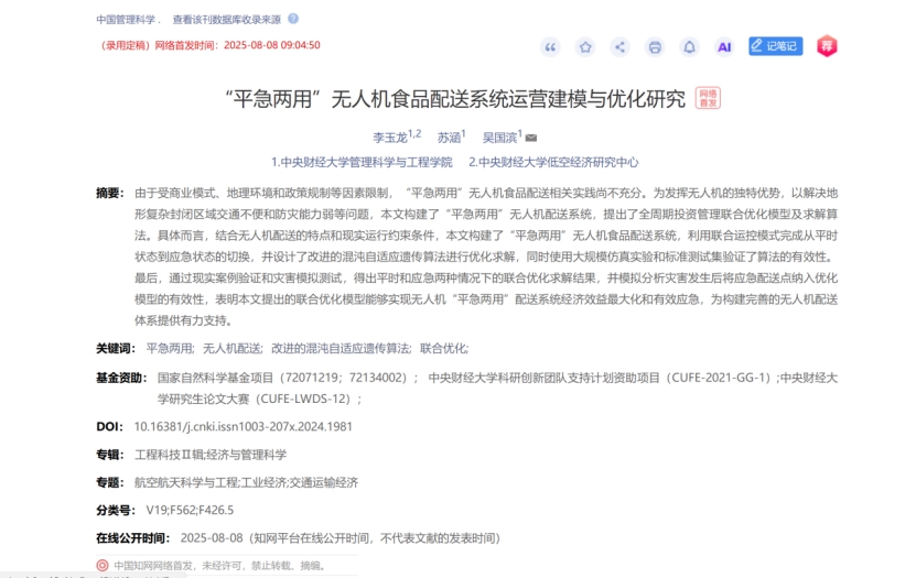 近日,公司李玉龙教授、苏涵博士生与吴国滨助理教授(通讯作者)合作的学术论文《“平急两用”无人机食品配送系统运营建模与优化研究》在管理领域权威期刊《中国管理科学》(2024版复合影响因子7.633,CSSCI,FMST1,自然基金委管理学部A级重要期刊)正式发表,并获网络首发(DOI:10.16381/j.cnki.issn1003-207x.2024.1981)。
