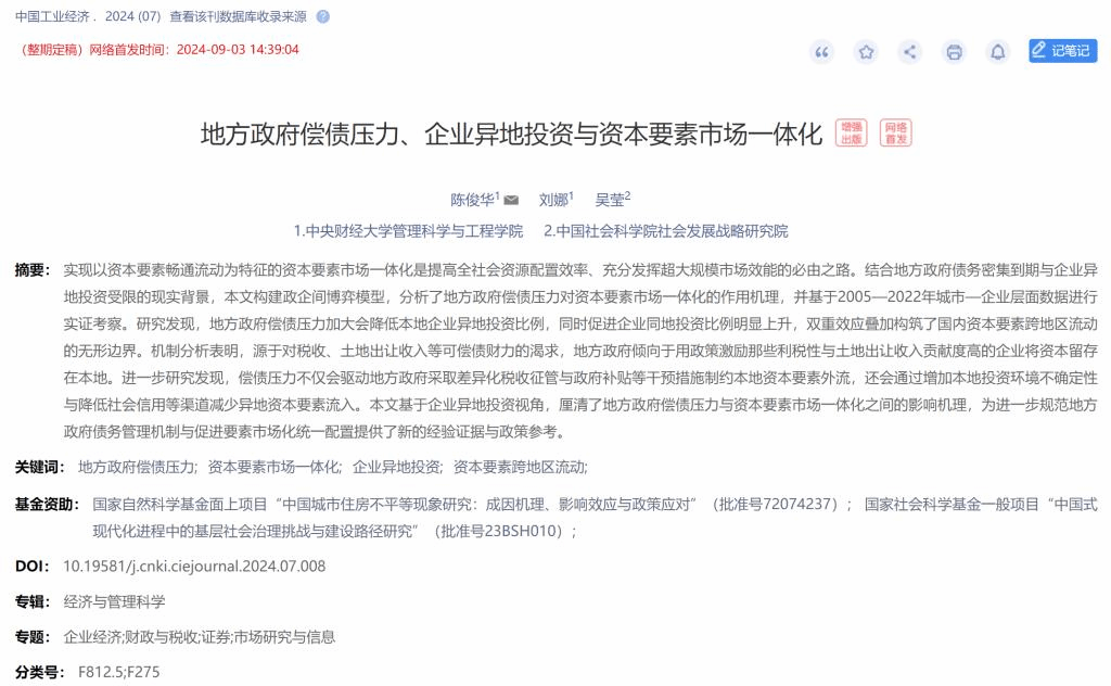 近日,xc体育陈俊华教授与2022级博士研究生刘娜、中国社会科公司吴莹研究员合作撰写的论文《地方政府偿债压力、企业异地投资与资本要素市场一体化》在国内经济学权威期刊《中国工业经济》2024年第7期刊发。